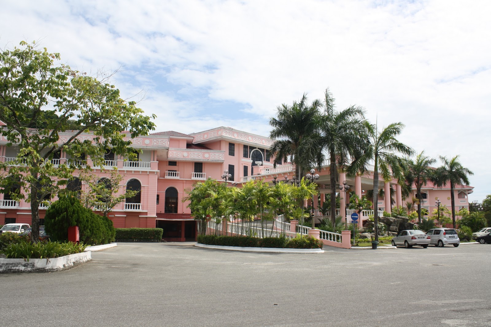 Our taxi pulls into the parking lot of a coral pink grandiose hotel with white columns. Gaudy only begins to scratch the surface. If “white trash” married into money, this hotel would be its equivalent in buildings; over the top and missing the mark in fashion. This hotel was a gift to ourselves. Because we’re traveling in a group of four, we’ve figured out that booking a double room will cost us each under $20 a night. It’s a bit of a fortune to backpackers like us, but it’s the one “nice” place we’ve allowed ourselves. The website promises not only a pool, but the equivalent to a water-park with a wave pool, three water slides, and multiple pools.